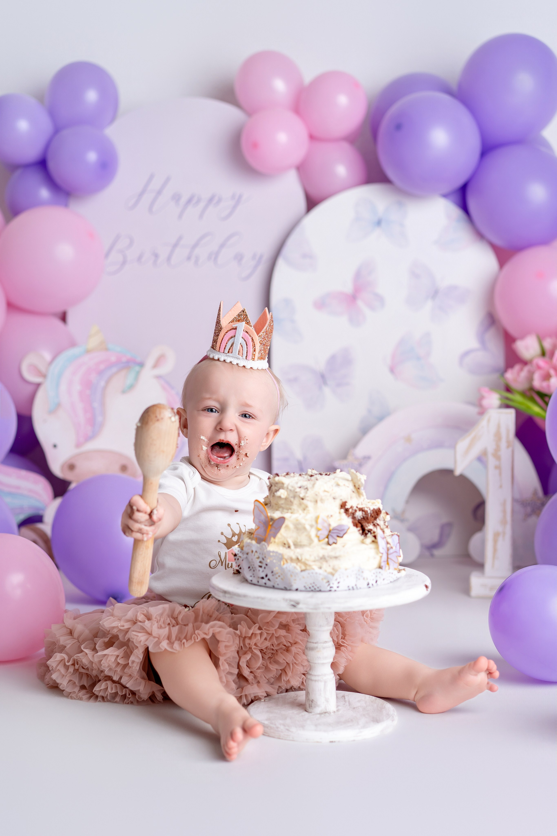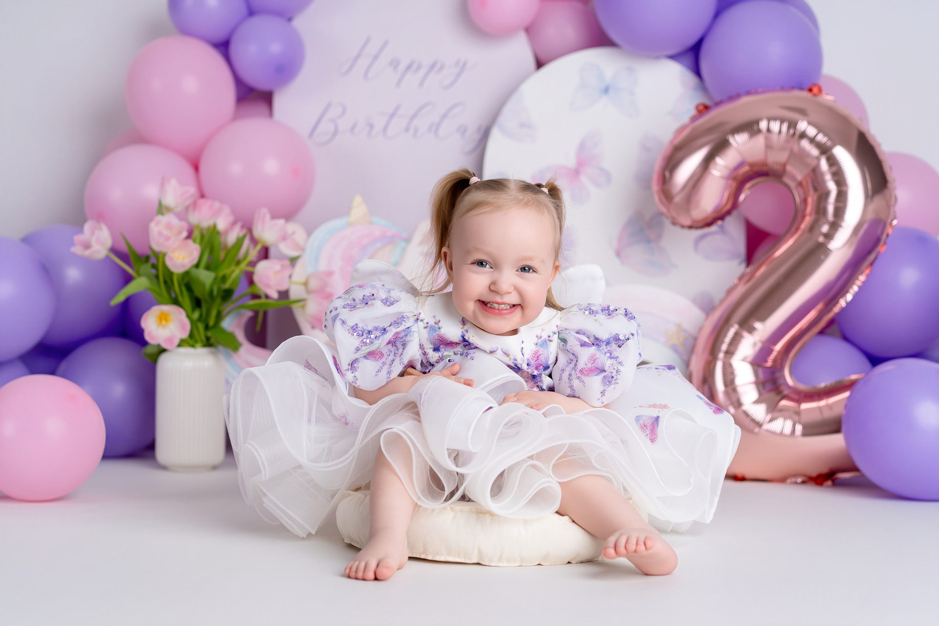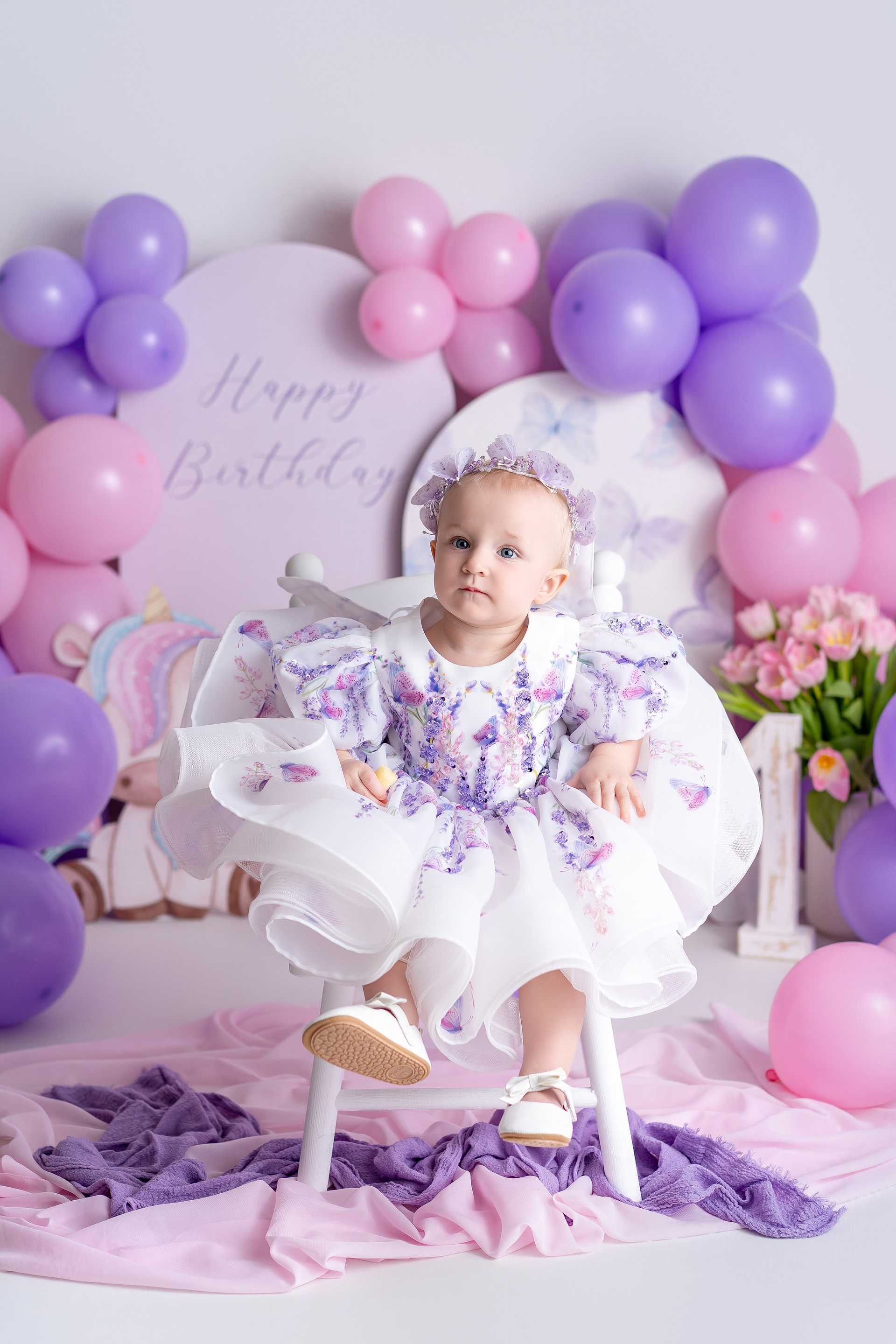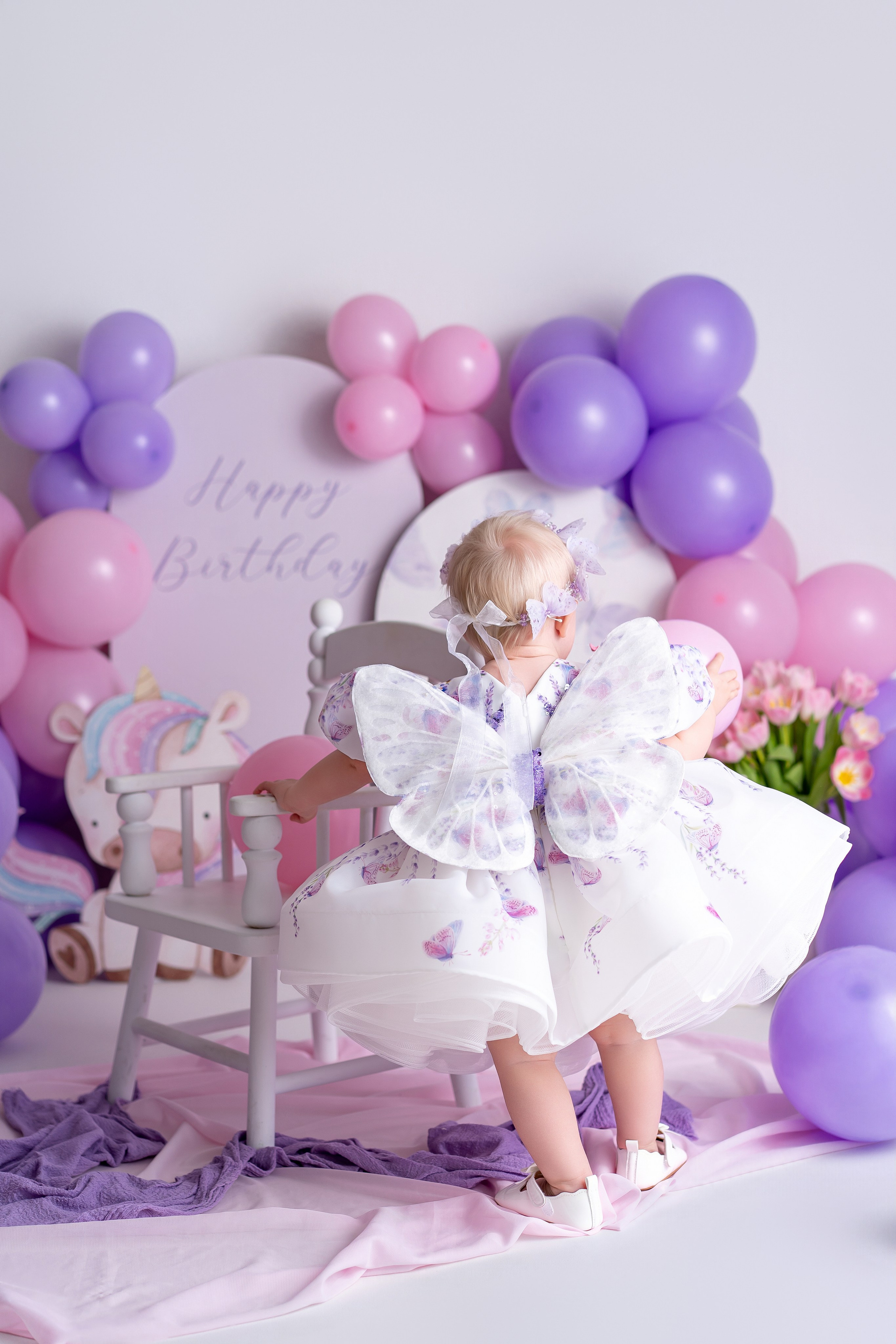 Photo setup in violet and pink tones with balloons and butterfly decor.